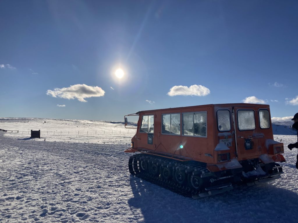 テラスでのんびりしたり、雪上車で周辺を散策したり、スノーシュー体験をしたりします。