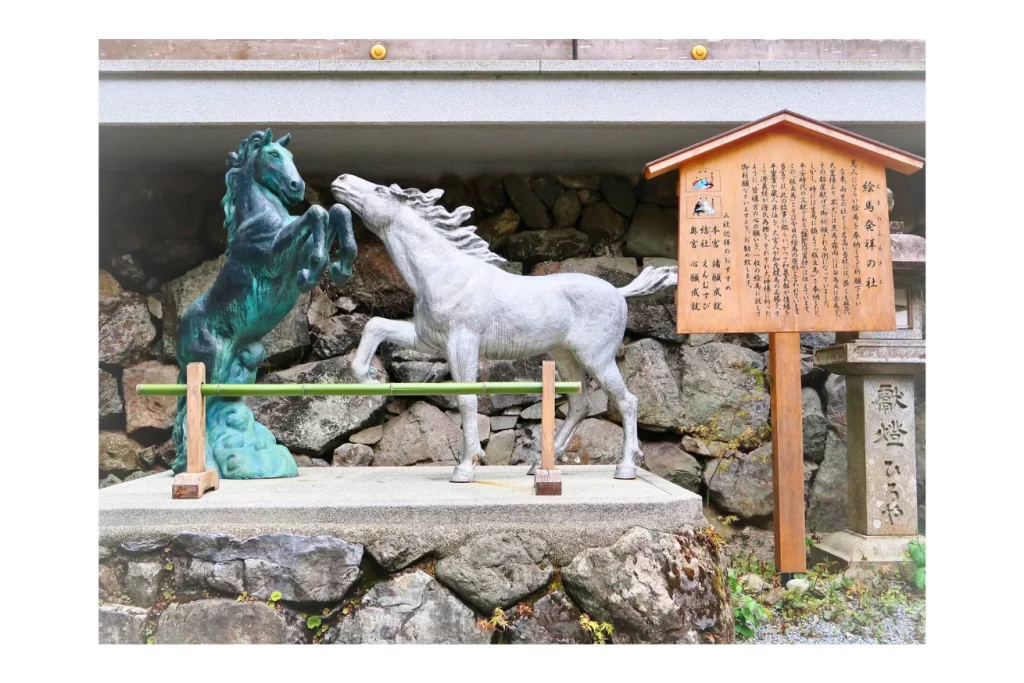 かつては降雨を願えば黒馬を、晴天を願えば白馬を奉納していたといわれ、この風習を代替する形で絵馬(板立馬)を奉納する文化が生まれたと伝えられています。