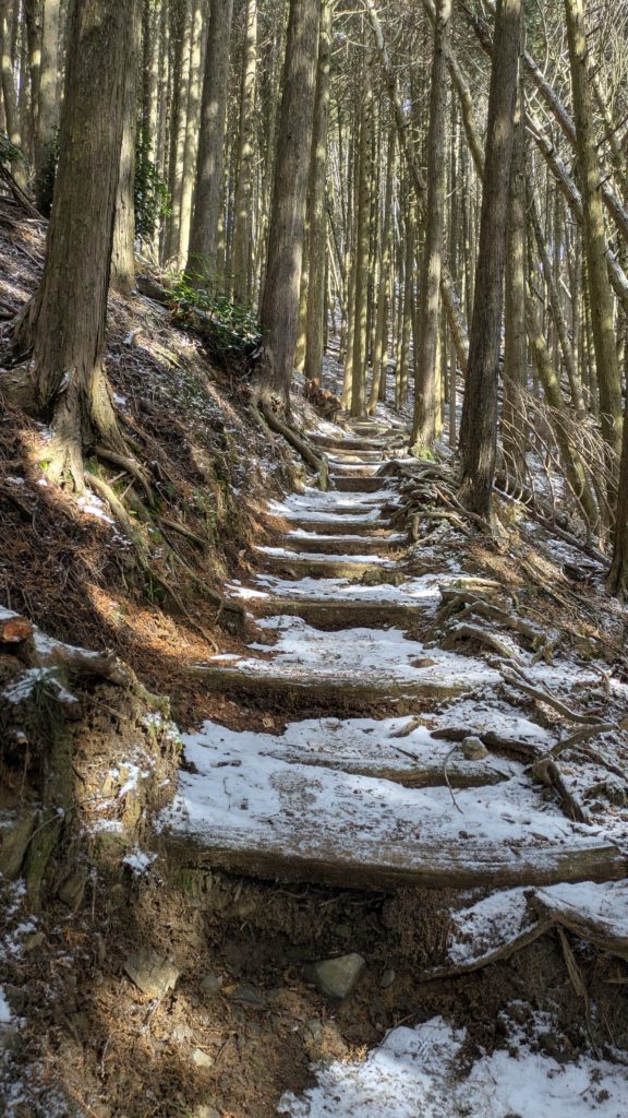 修学院駅を出発し、きらら坂という登山口を登っていきます。危険な箇所はないですが、傾斜のきつい登り坂はトレーニングにぴったりです。途中から積雪が出てきて、滑らないようにスパイクを履きます。