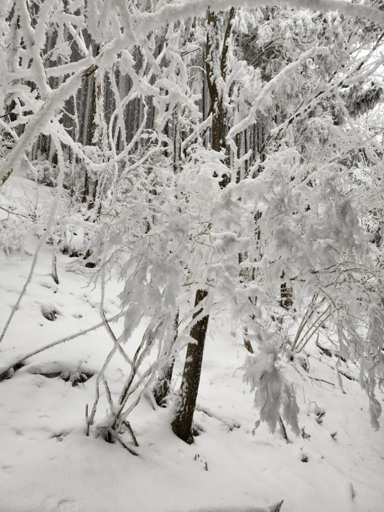 霧氷とは・・・樹木に雲や霧の中に含まれる水滴などが付着して凍り、霧氷となります。霧氷は風の強さに影響し、着氷する向きなどから「エビの尾っぽ」と呼ばれるような形になったり、気象条件によって様々な形で楽しませてくれます。