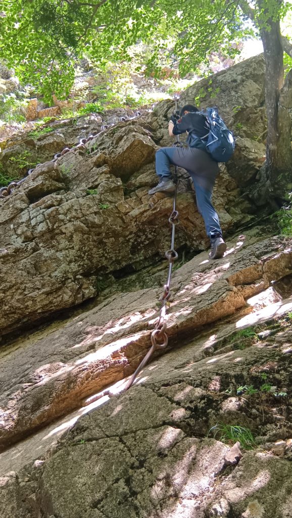 石鎚山名物!試しの鎖から始まって三つの鎖場がありますが、迂回路もあるので安心です。平日なので混雑も少なく、一歩ずつ修業の道を体感できますよ。